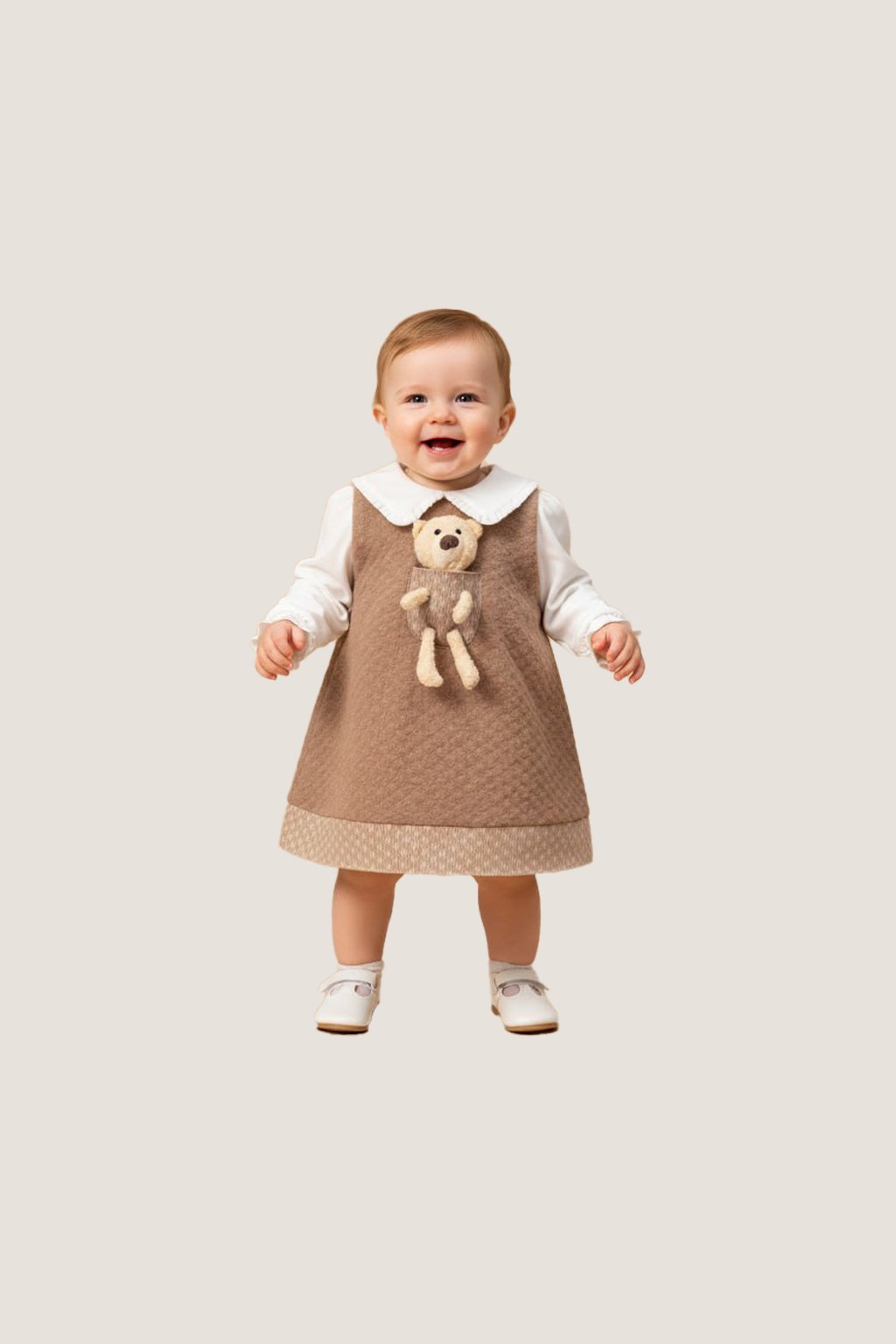 🧸 Cuteness overload! This Baby Beige Teddy Pocket Dress with a white collar and plush teddy bear is perfect for your little darling.