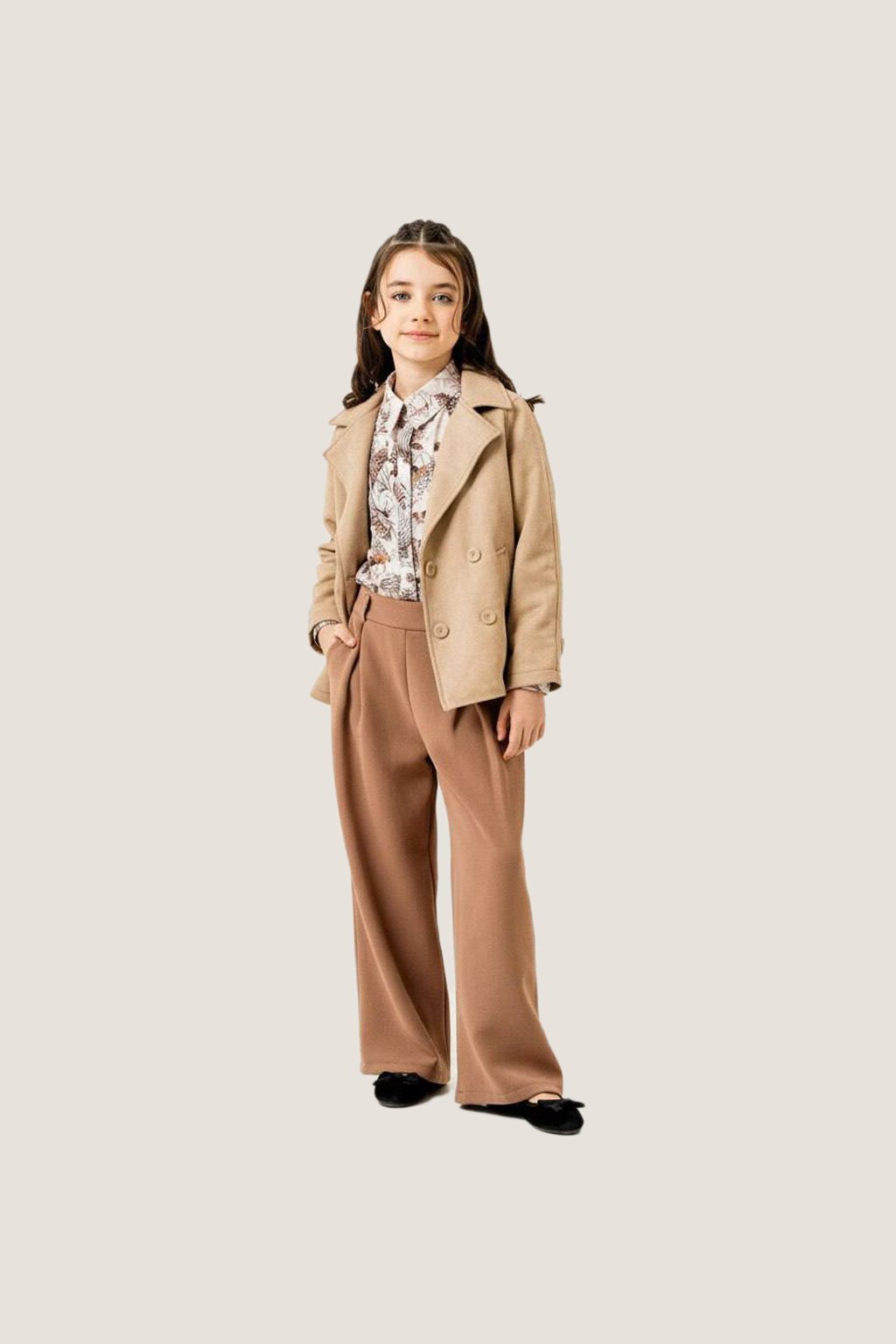 A chic and refined Beige Jacket & Brown Pants Set crafted for young fashionistas. The beige jacket features a double-breasted front with a tailored lapel design, creating a polished look. Paired with a stylish floral blouse and wide-leg brown pants, this set strikes the perfect balance between elegance and comfort. Ideal for family gatherings, festive occasions, or casual outings with a fashionable touch.