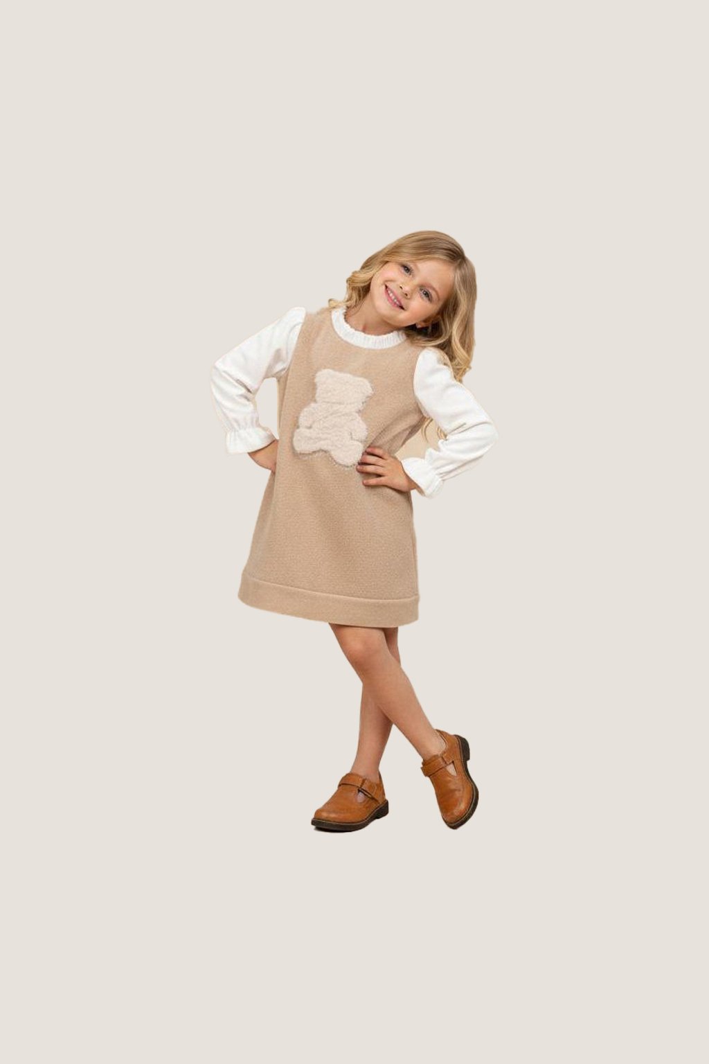 ✨ Cute & cozy! This Girls Beige Teddy Bear Dress with fluffy appliqué and layered design is perfect for playdates and outings.