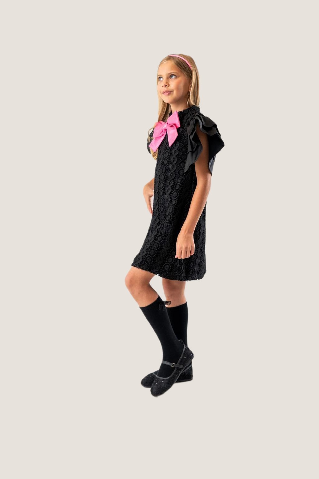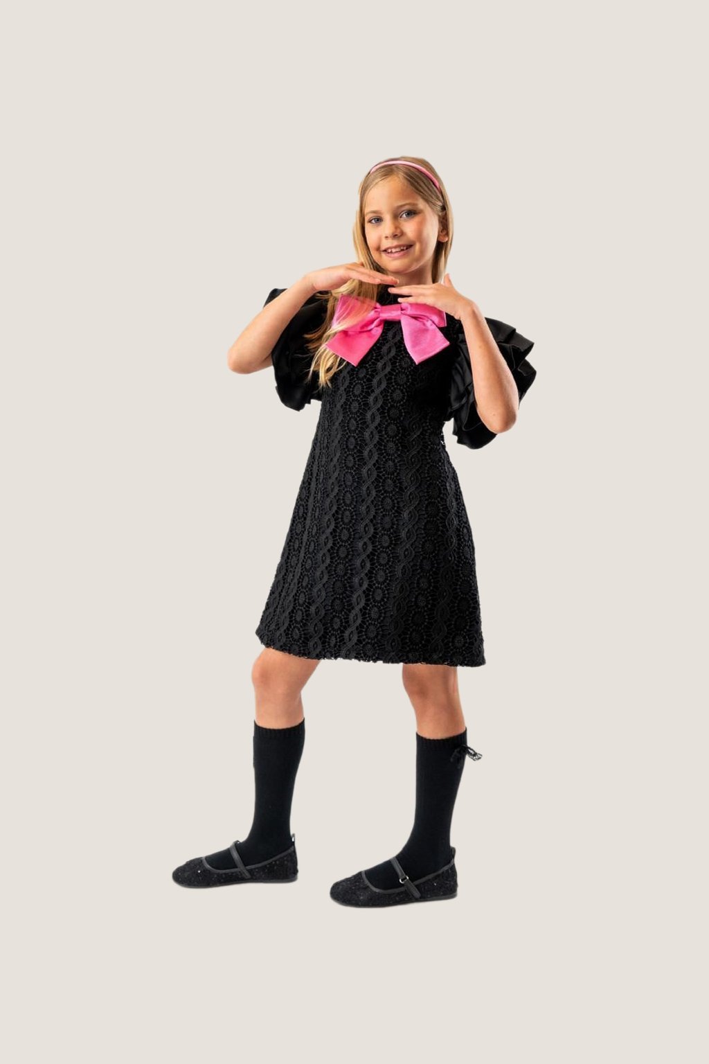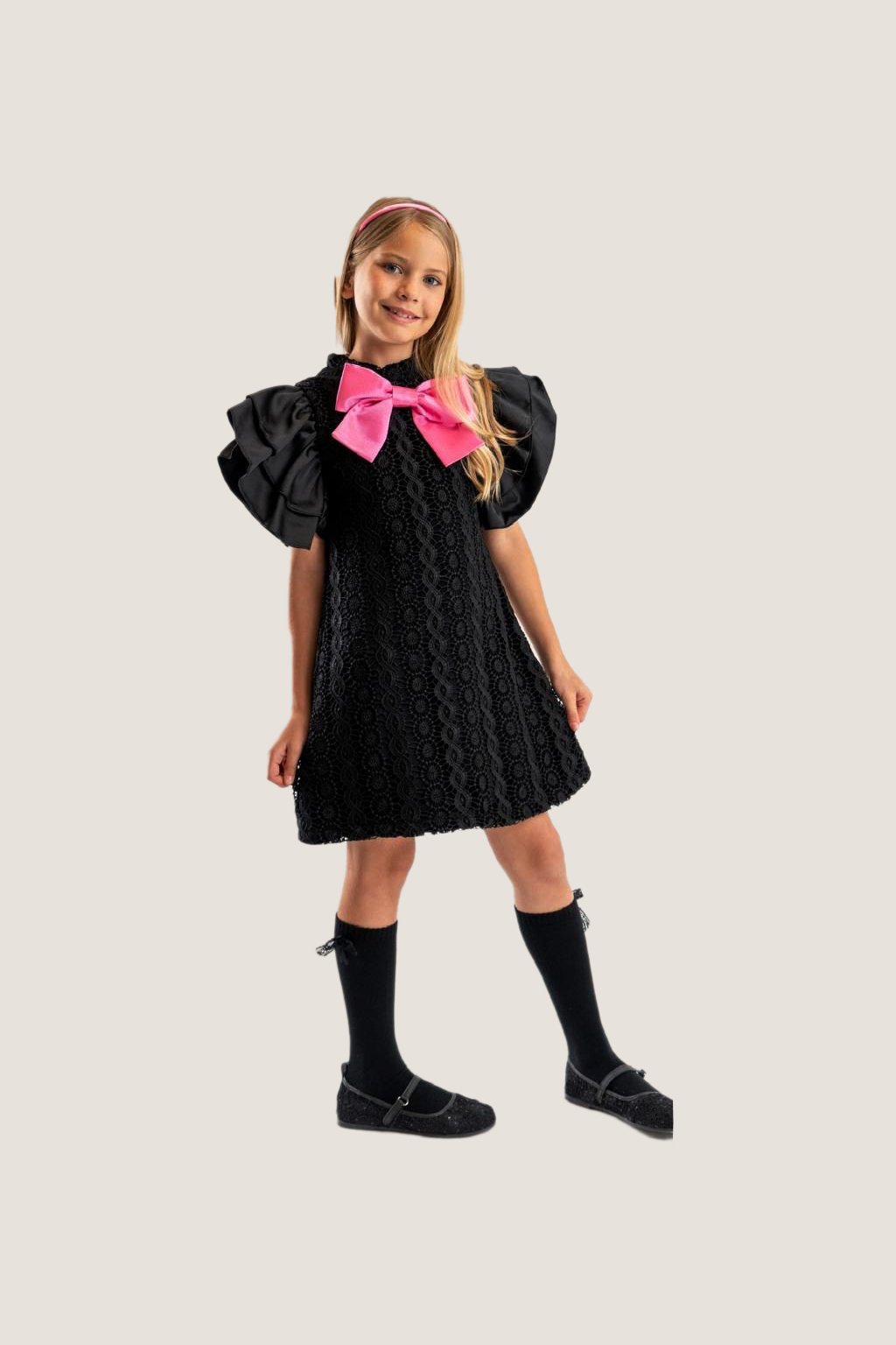 Girls Black Lace Dress with Puff Sleeves and Pink Satin Bow