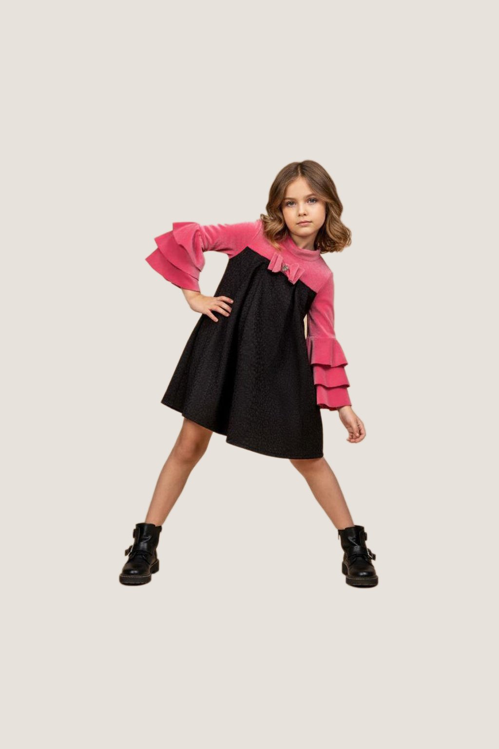 Trendy and bold, our Girls Black & Pink Contrast Dress is the perfect mix of comfort and style. Featuring a soft pink top panel with tiered ruffle sleeves, a black flared skirt, and a bow detail at the neckline, this dress is ideal for making a fashion statement while keeping it playful and fun.