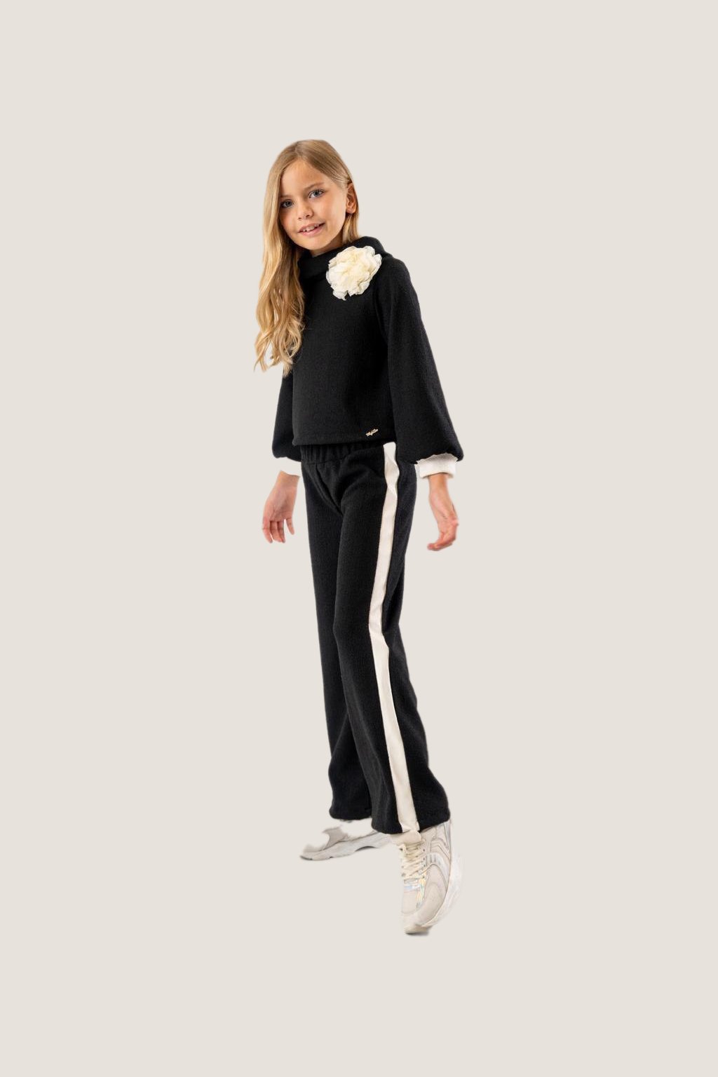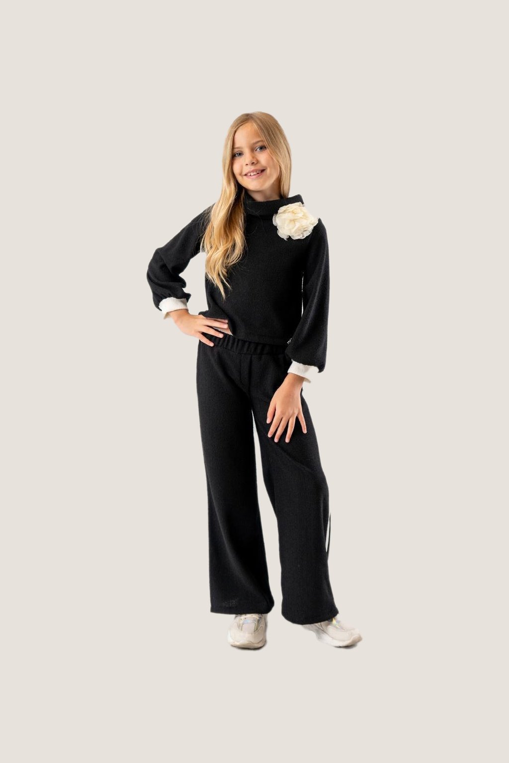 Girls Black Top with Flower Detail & Wide-Leg Pants Set