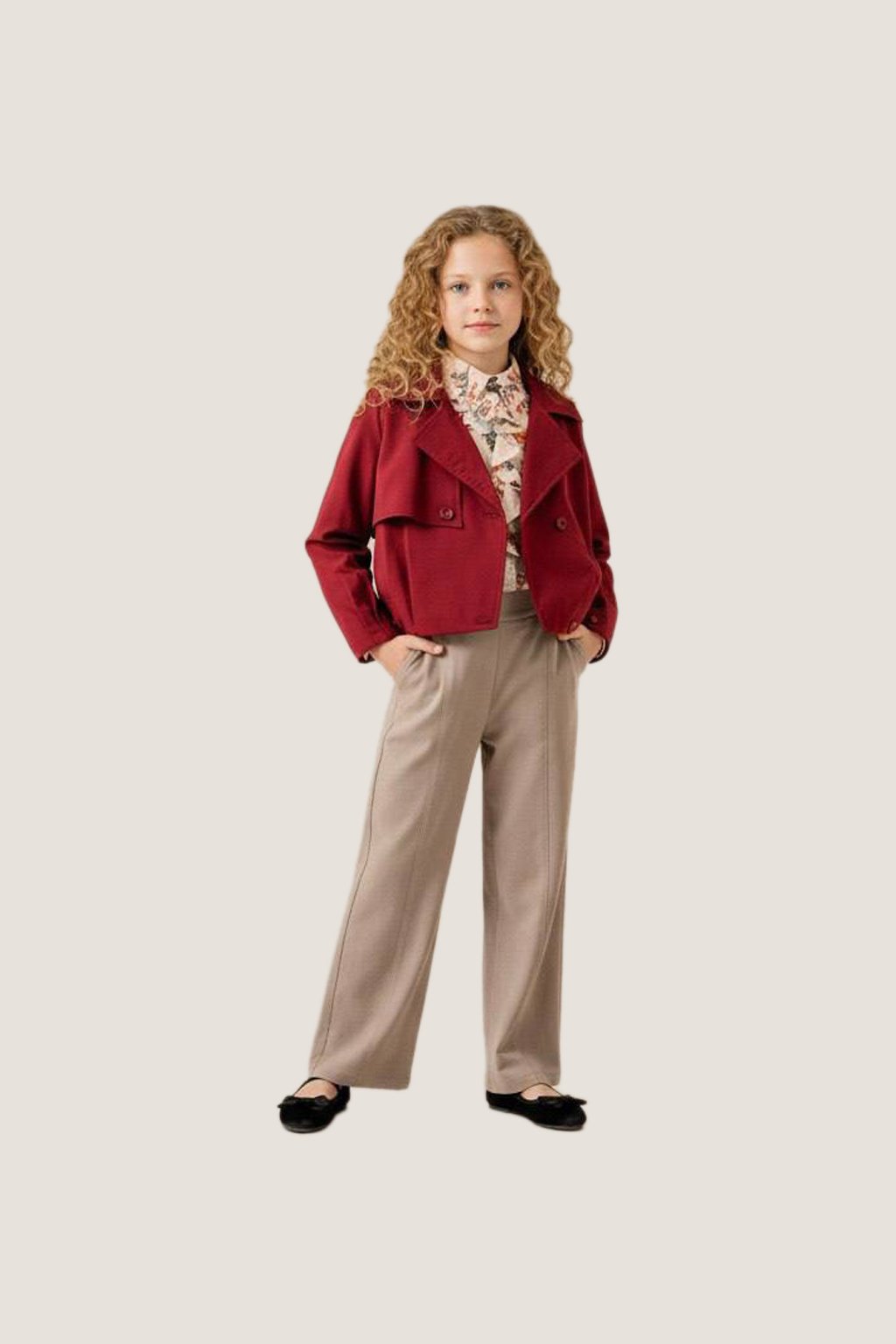 Elevate your little one’s wardrobe with this Burgundy Cropped Jacket & Beige Pants Set. The deep red double-breasted cropped jacket adds a touch of chic sophistication, paired with a delicate floral blouse for a feminine charm. The high-waist beige wide-leg trousers provide comfort and style, making this outfit perfect for both formal occasions and stylish day outings.