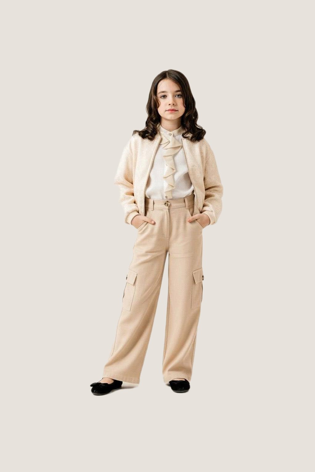 This Elegant Beige Jacket & Wide-Leg Pants Set is a timeless outfit for your little fashionista. The soft beige jacket features a subtle shimmer and a comfortable fit, layered effortlessly over a white ruffled blouse for a polished look. The wide-leg pants with side cargo pockets combine elegance with functionality, making them perfect for both casual chic and semi-formal occasions.