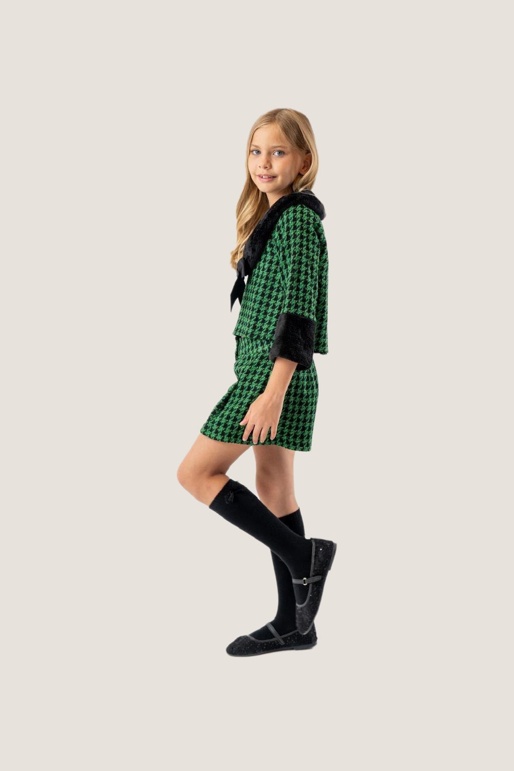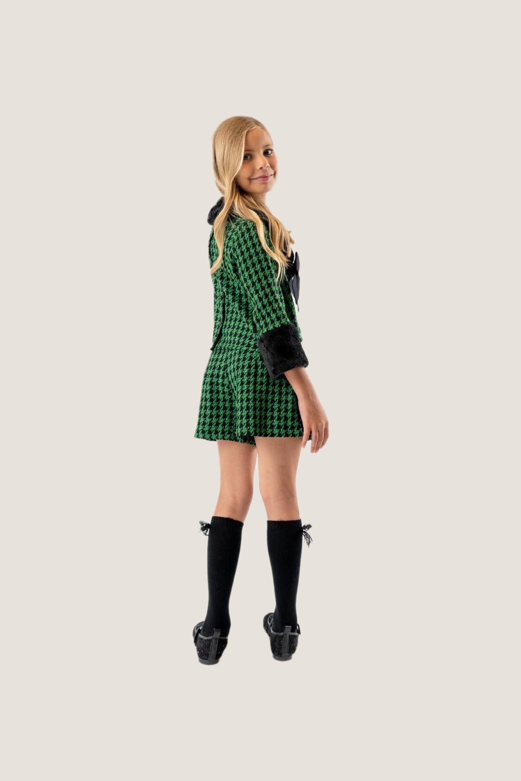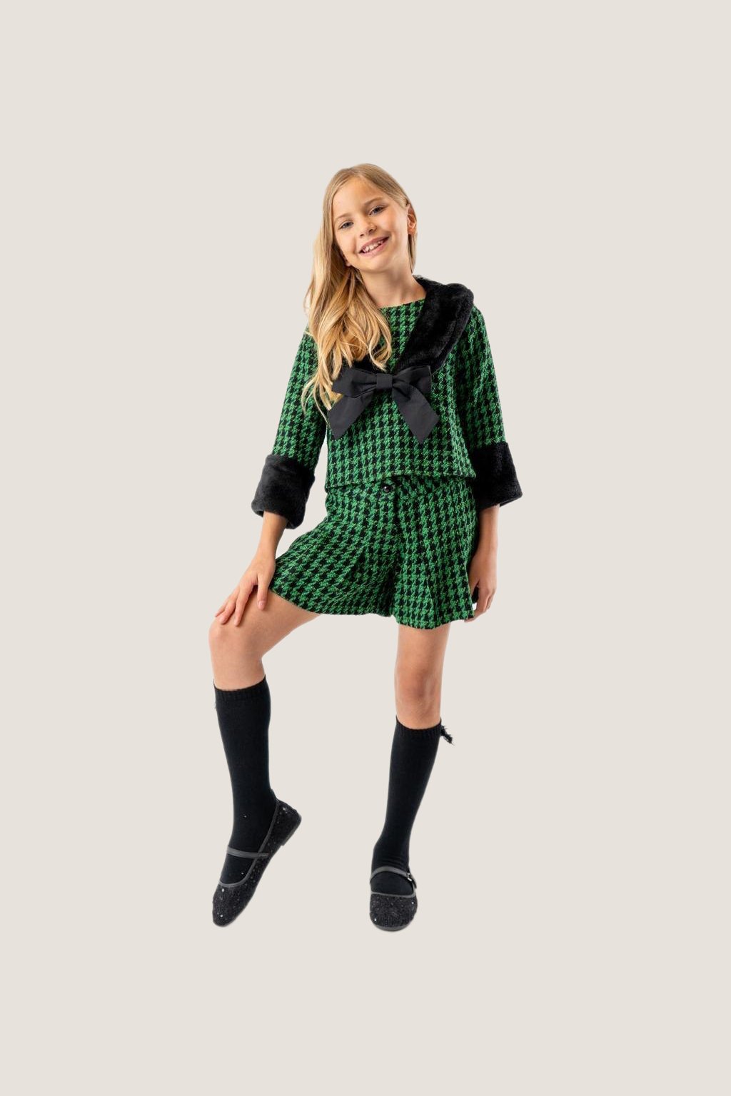 ✨ Bold & chic! This Girls Green & Black Houndstooth Set with plush trim and bow detail is perfect for parties, festive events, and stylish outings.