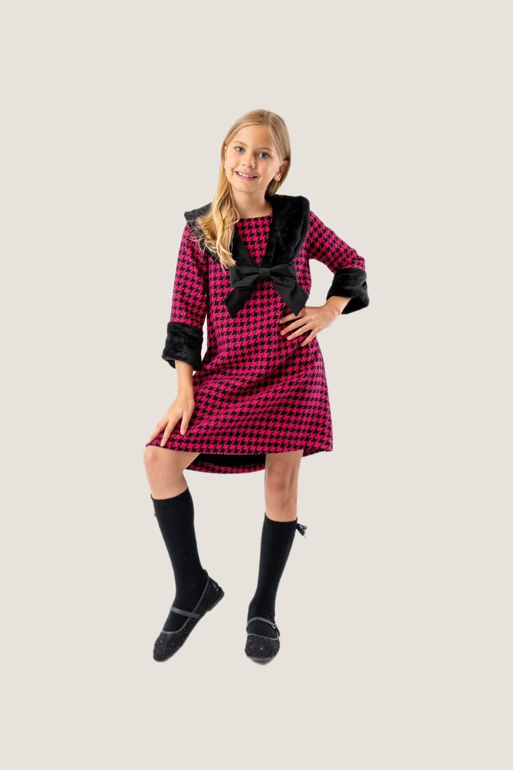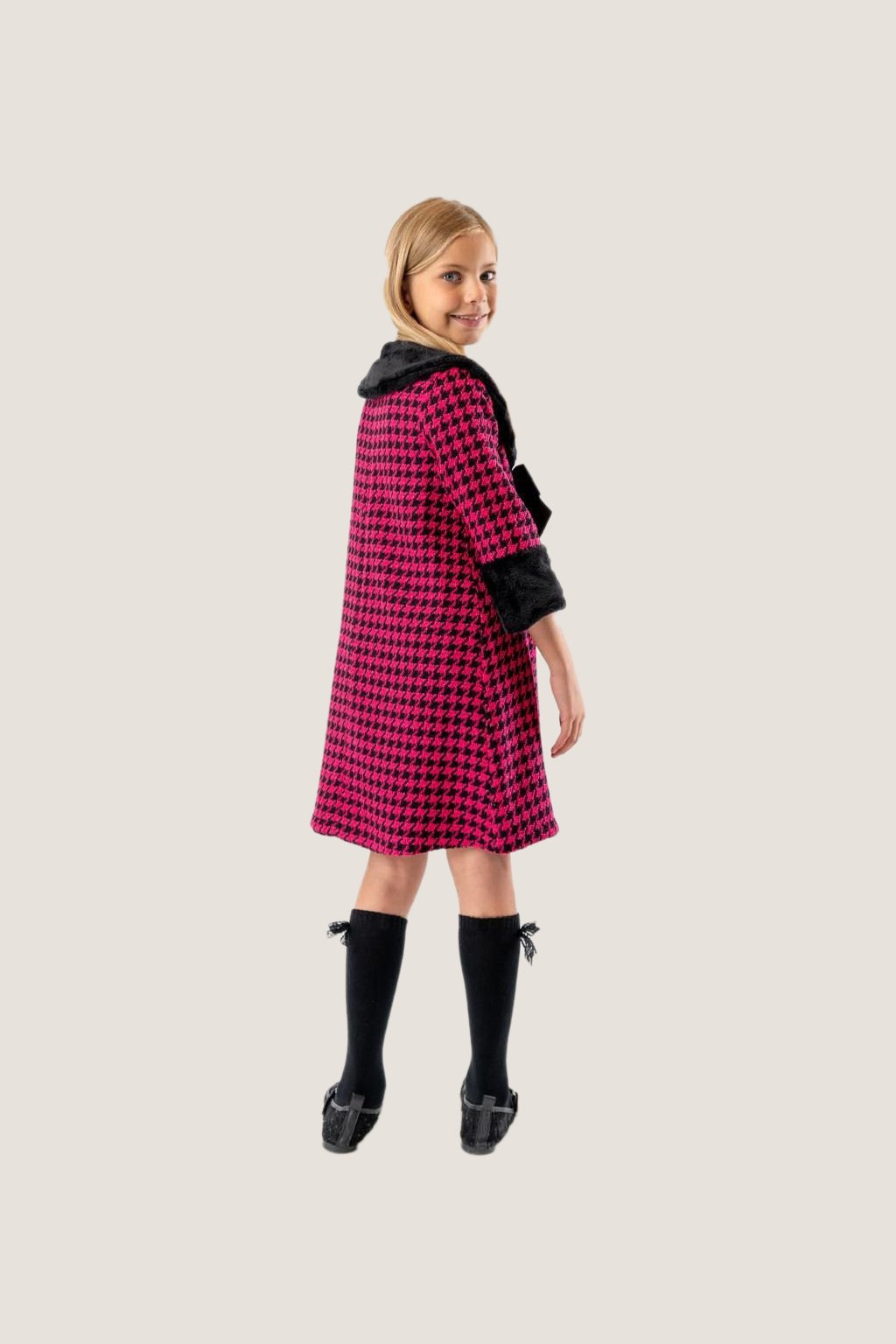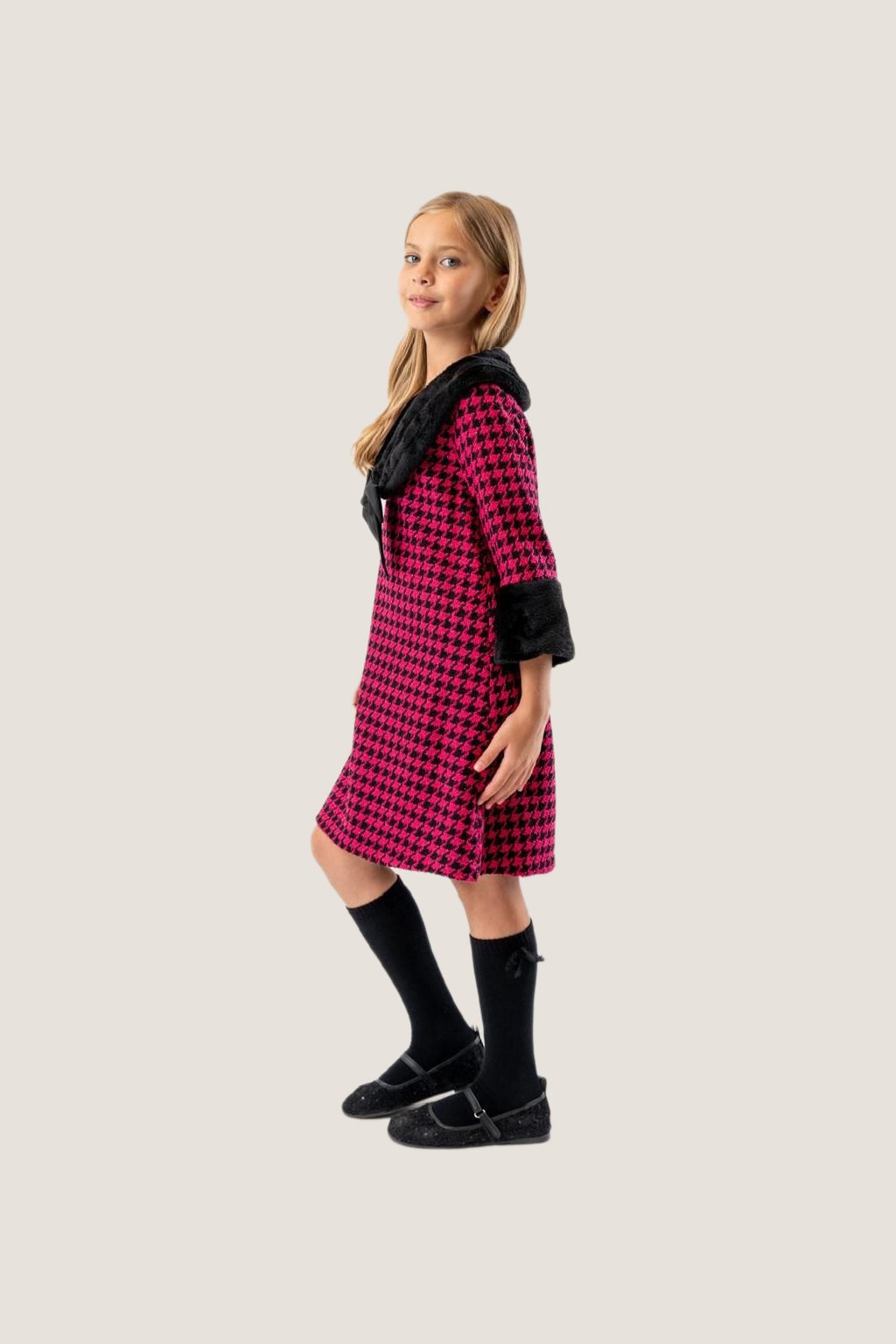 Stylish and cozy, our Girls Pink & Black Checkered Dress is a must-have for her wardrobe. Made with a soft woven fabric in a striking checkered pattern, this chic dress is detailed with a plush black collar and sleeve cuffs for an elegant finish.
