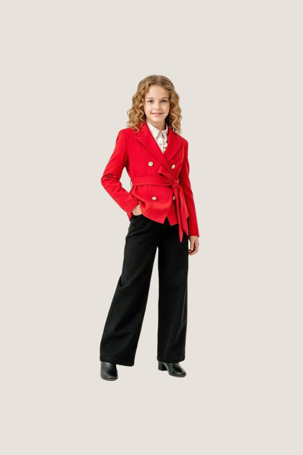 Girls’ Red Belted Blazer with Black Wide-Leg Pants Set