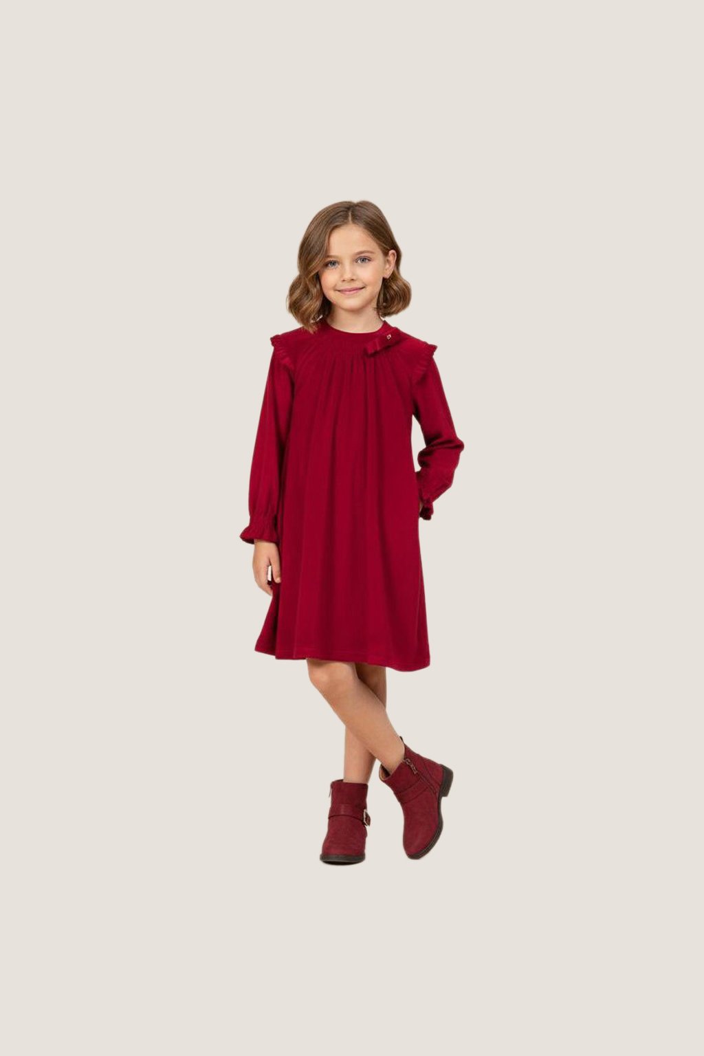 Simple yet graceful, our Girls Red Long-Sleeve Pleated Dress is a wardrobe essential for special occasions and festive gatherings. Designed with a round neckline accented by delicate pleats, soft long sleeves with elastic cuffs, and a relaxed A-line silhouette, this dress combines comfort with effortless charm.