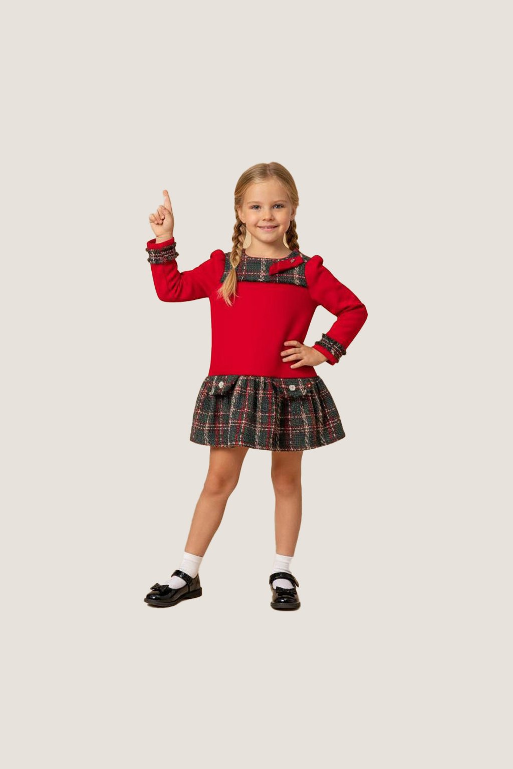 Stylish and festive, our Girls Red Plaid Trim Dress is a perfect blend of charm and comfort. The bold red bodice is paired with a tweed-style plaid skirt, cuffs, and neckline trim, adding a classic touch to this modern silhouette. The pleated skirt with decorative button detail gives it a playful yet elegant finish.